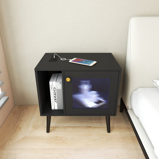 Smart FENDEE Modern Nightstand with Charging Station and Glass Door, Wood Table for Bedroom in Black