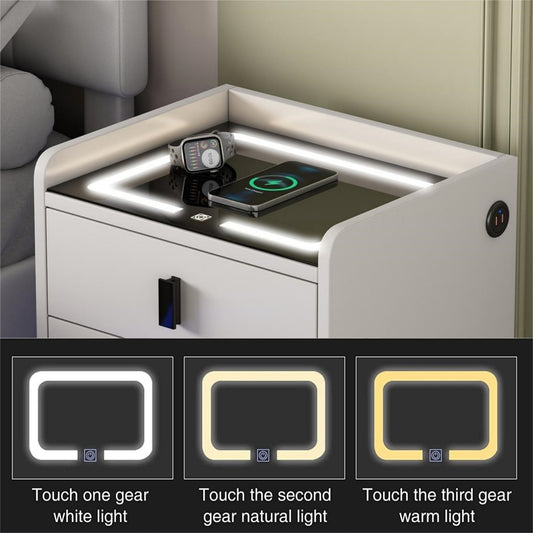 Nightstand with Wireless Charging Station,USB Charging and Adjustable LED Lights, Modern End Table with 2 Drawers for Bedroom,White